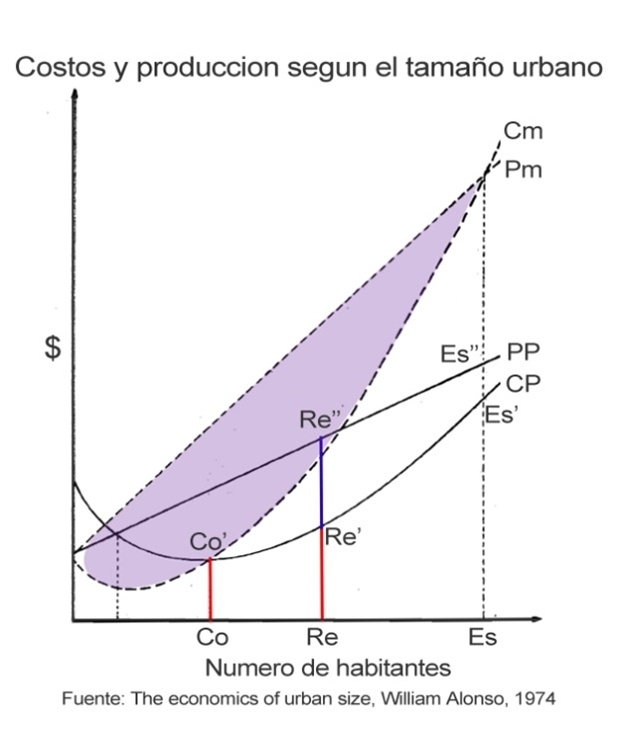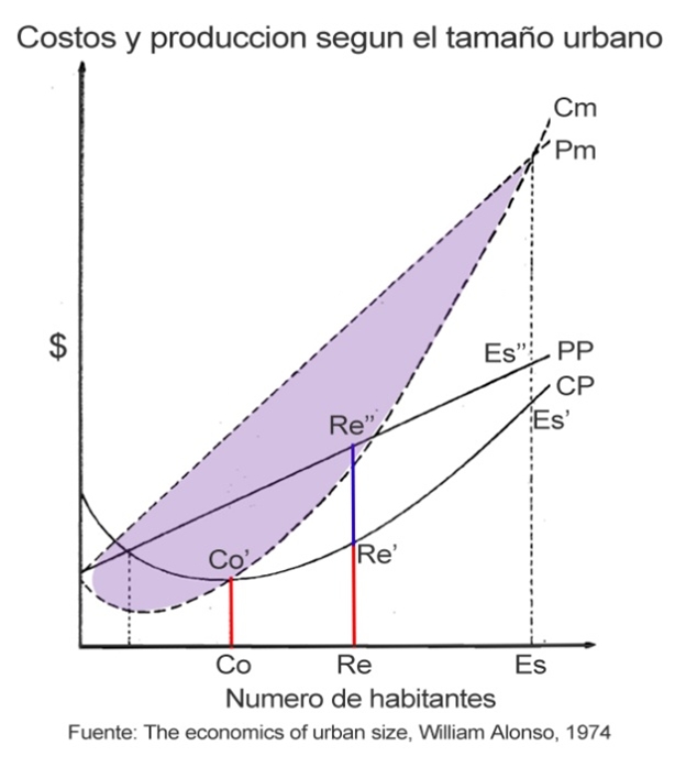 William Alonso, uno de los más importantes economistas urbanos del siglo XX, propuso el siguiente análisis para comprender las diferencias de objetivos entre distintos estamentos (5 y figura a continuación): si consideramos distintos tamaños de población de una ciudad, encontramos relaciones variables entre costos promedio (CP), como congestión y polución, y beneficios productivos (PP). Para una comuna, lo más conveniente sería lograr una configuración que minimice el costo promedio de funcionamiento (Co-Co’). Como las industrias y basurales pueden estar en otros sectores y los residentes pueden desplazarse al trabajo, un alcalde ganará más votos mejorando la calidad ambiental de sus barrios. Pero el Estado tiene otras prioridades, para él es más importante que la ciudad produzca al máximo de su capacidad y así maximizar el aporte a la economía nacional. Esto se representa por el área “Cm-Pm” (diferencia acumulada entre costo y producción marginales) y se logra en un nivel donde los costos por habitante (Es-Es’) son muy elevados y el beneficio promedio (Es’-Es’’) es bastante bajo. La relación óptima entre costos (Re-Re’) y beneficios (Re’-Re’’) por habitante podría corresponder al objetivo de un gobierno regional, obligado a mantener un equilibrio entre calidad ambiental y productividad, ya que sería imposible o absurdo trasladar toda la basura y los empleos a otra región. Esta explicación es excesivamente simple, y por ejemplo el Estado no puede ignorar totalmente la calidad ambiental, pero permite ilustrar bien las tendencias dominantes a cada nivel.