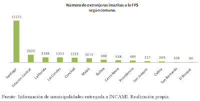 Si observamos la información recopilada por INCAMI(4) en el año 2011, en donde la institución demandó a los diversos municipios de la Región Metropolitana(5) y algunas comunas aledañas, el número y perfil socio-económico de los extranjeros inscritos a la FPS, podemos afirmar que existe una deficiencia institucional por parte de algunos municipios en captar y evaluar la situación (de vulnerabilidad) de los migrantes.